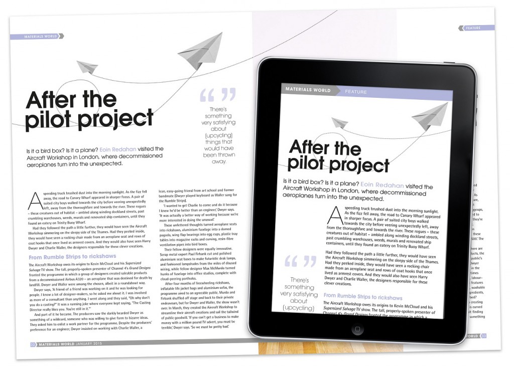 Good tablets and mobile phones run modern browsers and have powerful processors, so apps running on them can process more advanced CSS styling. A carefully-designed print page that looks (see below) can also look beautiful in HTML. Some of the clever stuff includes dynamic columnisation of content, and interpreting Materials World's trademark chevrons.