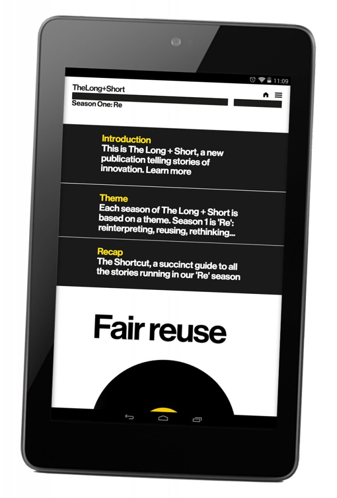 The app has been designed so that the HTML is edited once, and pushed out to multiple platforms. This is neat as a cost-effective way of publishing for maximum audience reach; The Long + Short can be accessed from a desktop, through the Apple and Android stores, and through a mobile-responsive web browser for those on devices without a supporting app. The content can also be read in any orientation, and it all reflows nicely when the device is rotated. To top it off, the app is lightweight, and the issues can be viewed almost instantly without a long wait for content to download.