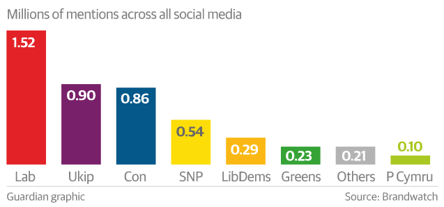 The Guardian have provided a mention graph (see below) that clearly shows Labour as front runners. Unfortunately these don't show whether all the mentions are positive, so don't get carried away! However all publicity is good publicity, right?